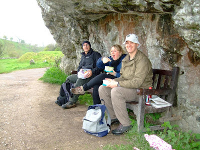 So having parked in a layby we made our way up a short incline to pick up the Limestone way with Robin Hoods Stride (mock Beggars Hall) ahead of us (see pic). Our first stop being the hermits cave (not much to see there then) before carrying on over the hills towards Bradford Dale. Here we found ourselves running the gauntlet of one field after another of killer cattle, before eventually having lunch under a rocky incline outside Youlgrave. During the course of the day I became something of a quartermaster, handing around assorted: hats, gloves, plasters and binoculars. Unfortunately I had run out of forks for the consumption of tuna.